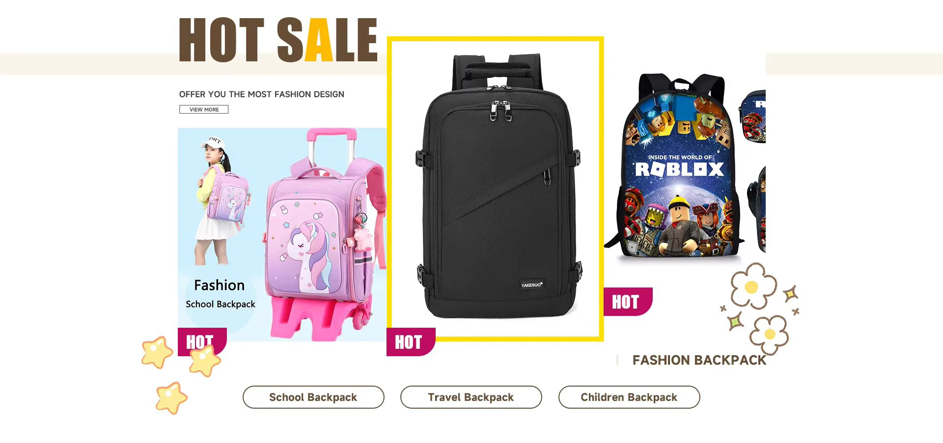 Prodotti principali: Zaino per la scuola, zaino per Laptop, zaino per mamma, zaino da esterno, zaino da viaggio